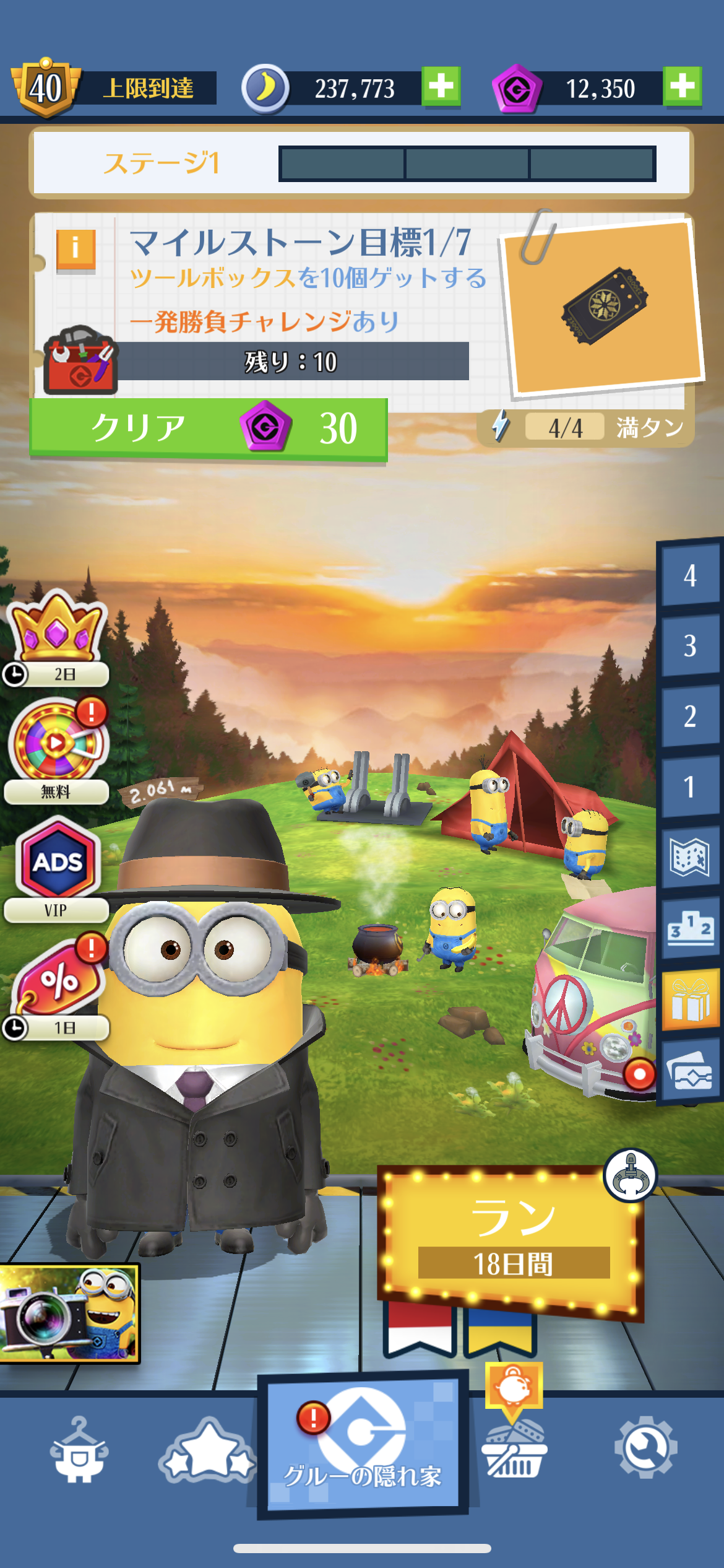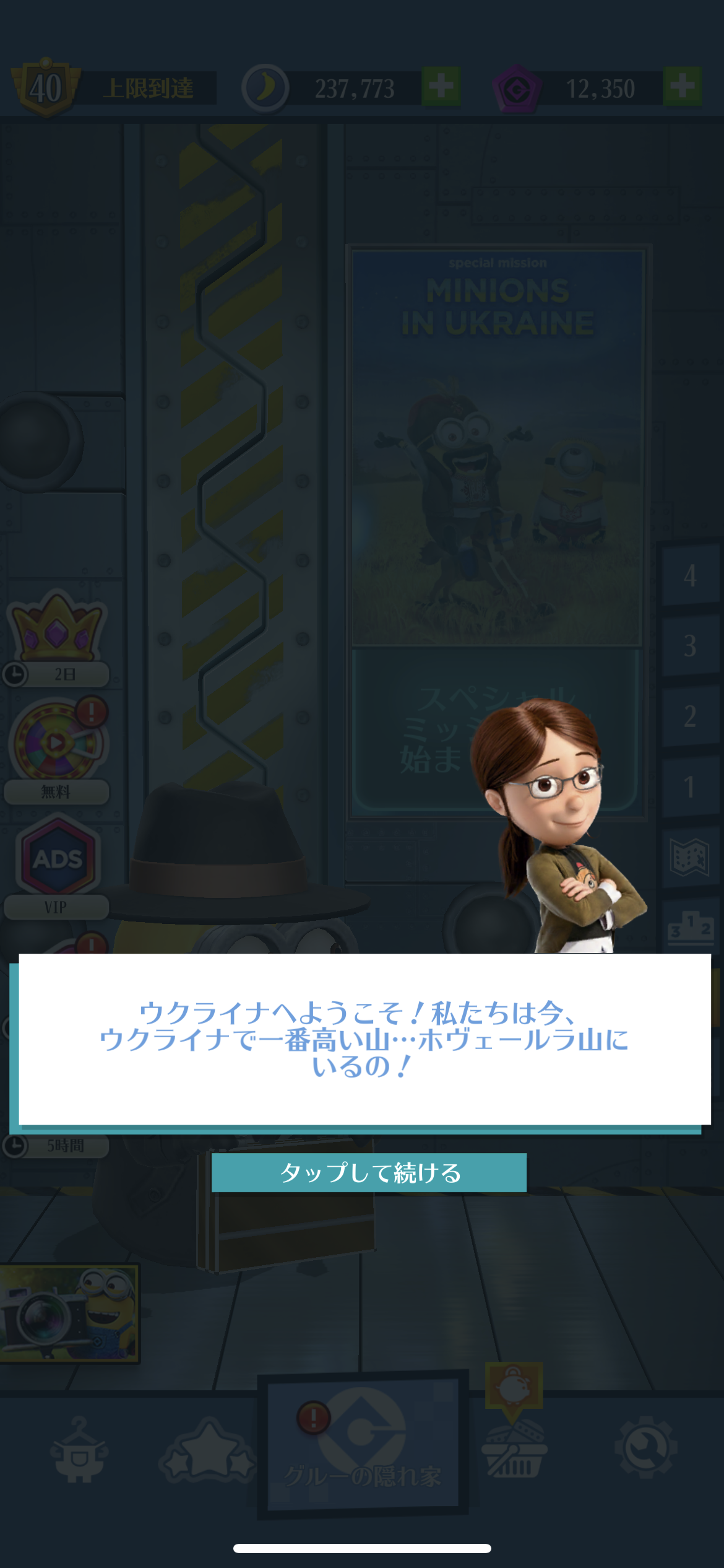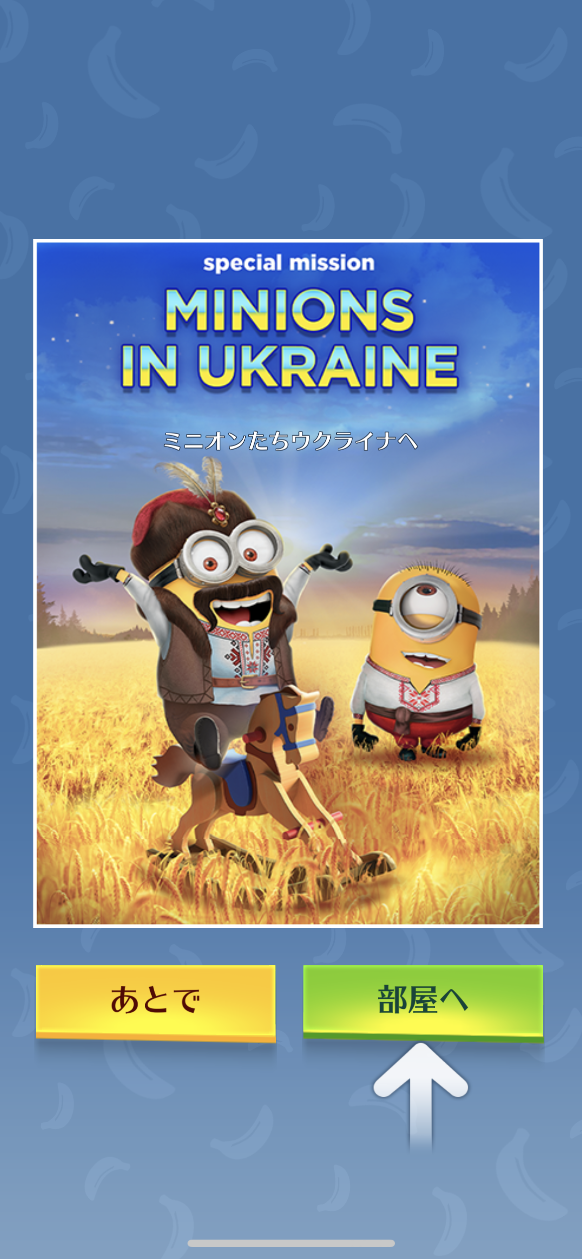 スペシャルミッション:ミニオンたちウクライナへ 2023年08月22日 本日新しいスペシャルミッション「ミニオンたちウクライナへ」がスタートしました。ウクライナにやって来たミニオンたちと三姉妹。新しい星を見つけてミニオンたちはグルーにちなんだ名前をつけたいとのことで、まずはキャンプの準備をすべくツールボックスを集めることに。ちなみに背景のモブが可愛いのはもちろんのこと、右下にあるキャンピングカーが気になります。なんとも可愛いデザインでこれに乗って世界各地を回っているんでしょうか。ともあれ新しいランのスタートです。はりきって頑張っていきましょう!! < 前の記事次の記事 >