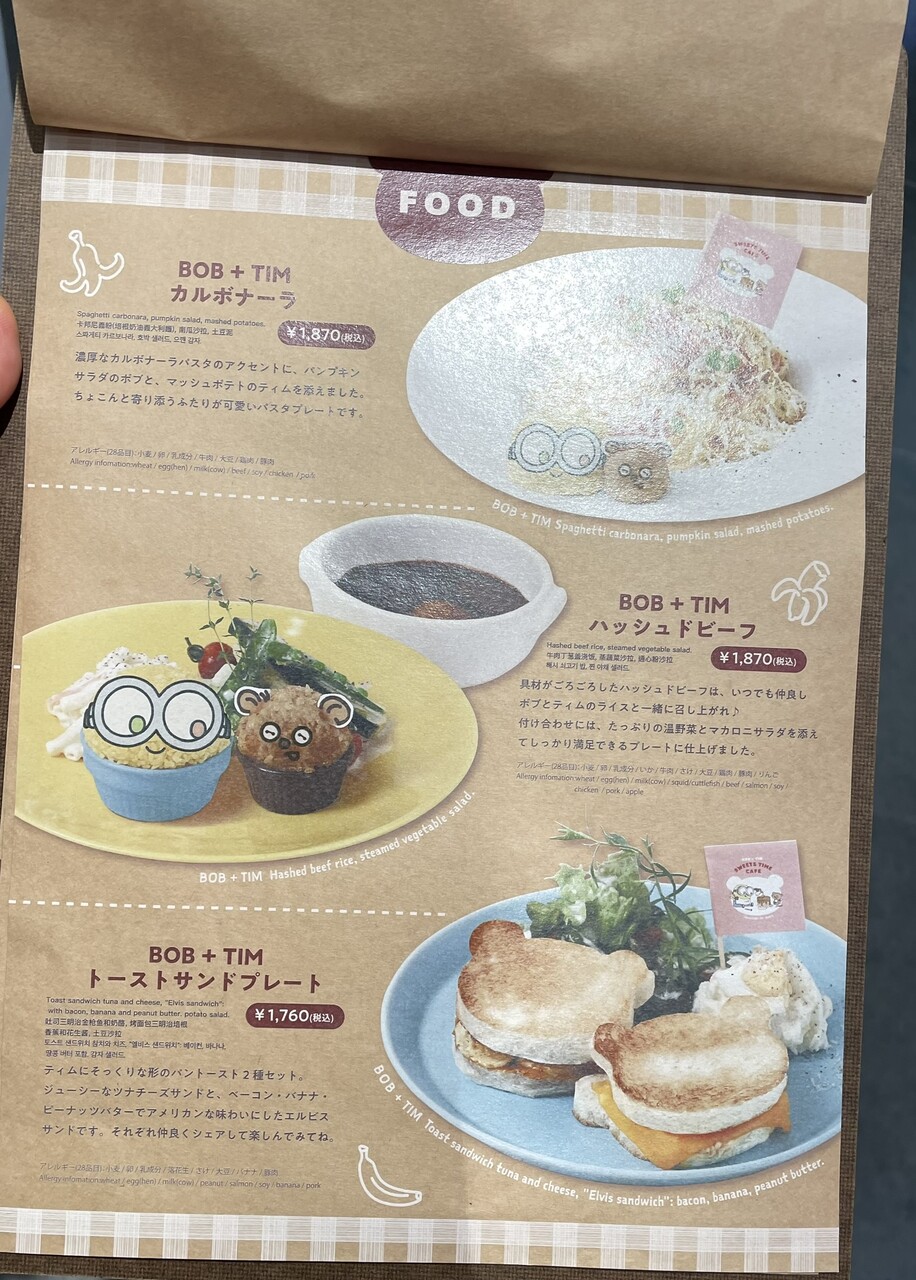 店内の壁や内装はボブ&ティムだらけ。フォトスポットも設置されていました。立って撮影するのは食事が終わって会計時にしてくださいと説明されたので、座った状態で撮れた店内をパシャリと撮りました。