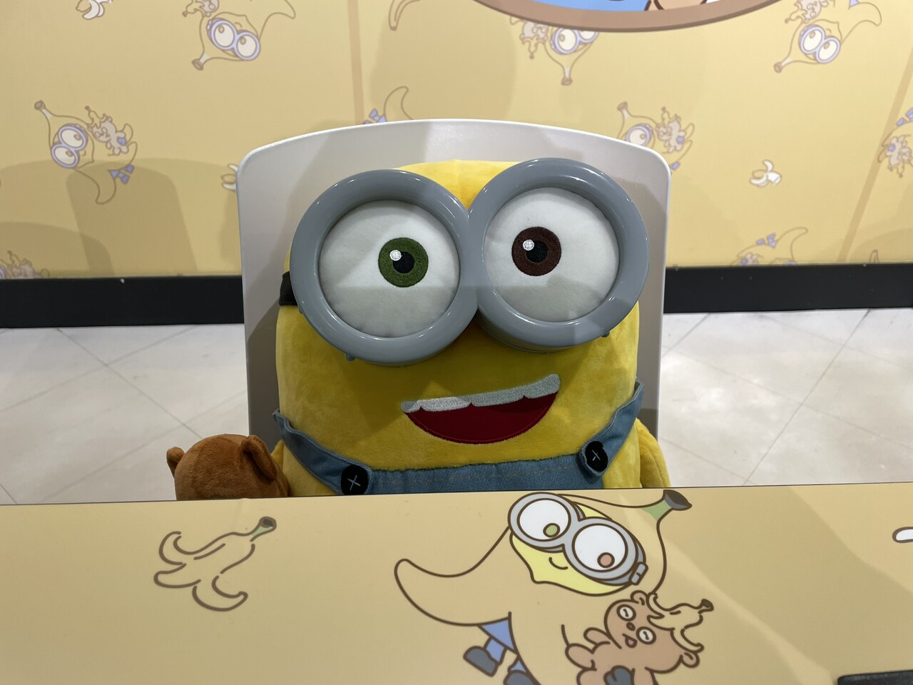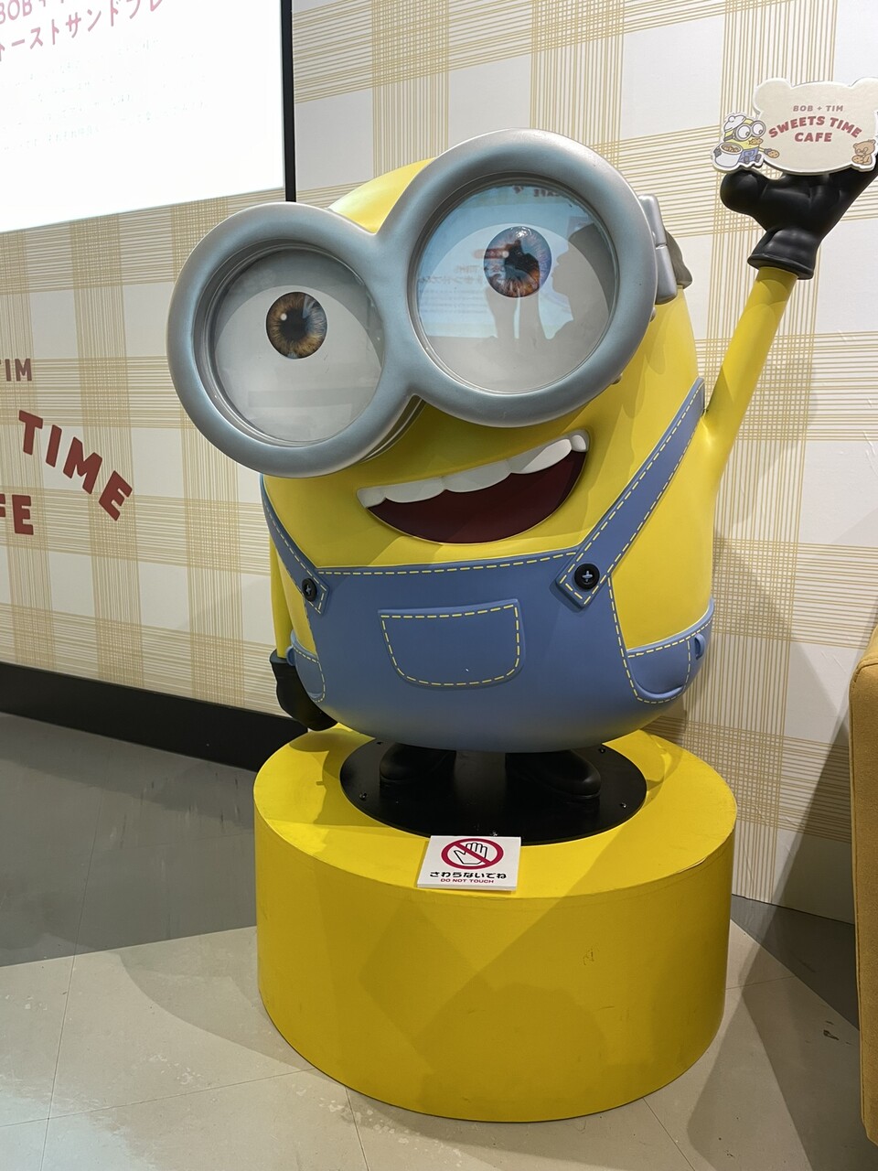 ボブちゃんが手に持っているものににっこり。ミニオンサマーハウスではレイをもってましたが、こっちのボブちゃんはお店のシンボルを持ってます。