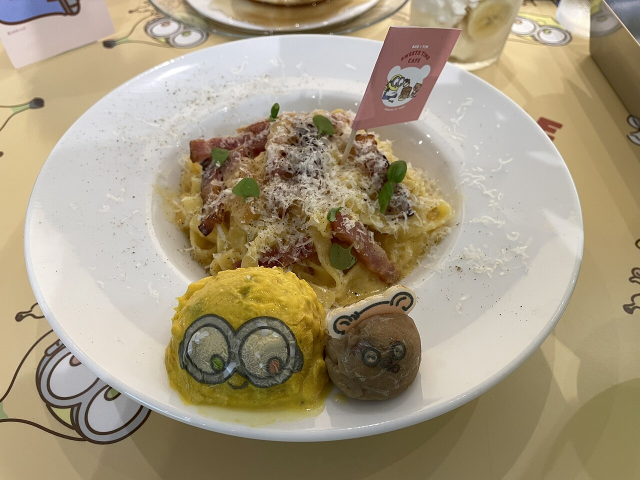 カルボナーラはパスタが太くてもちもちしてるので意外とボリュームありました。しかもこのお皿は中央に窪みがある作り(お椀みたいな形)で、パスタがけっこう詰まって入ってるのでかなりお腹いっぱいになります。ホットケーキもボリュームありまくりなので一緒に食べる人はファイトです。