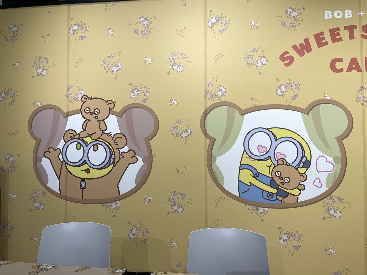 管理人が座った席のテーブルと前の壁。テーブルもボブティム仕様。壁にはあちこちで見かけるボブ&ティムイラストを大きくしたものが壁紙として使用されていました。