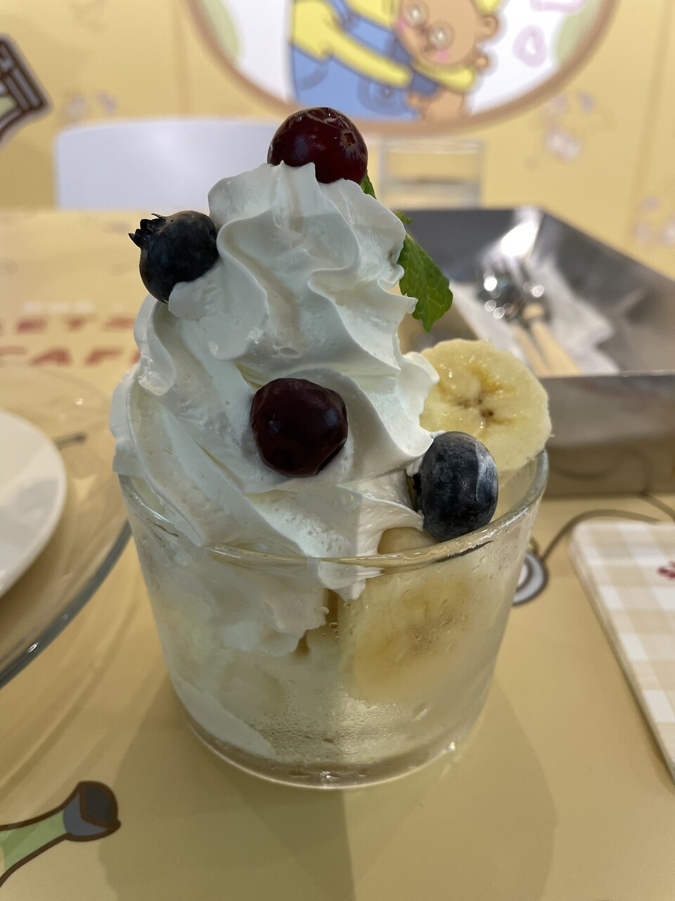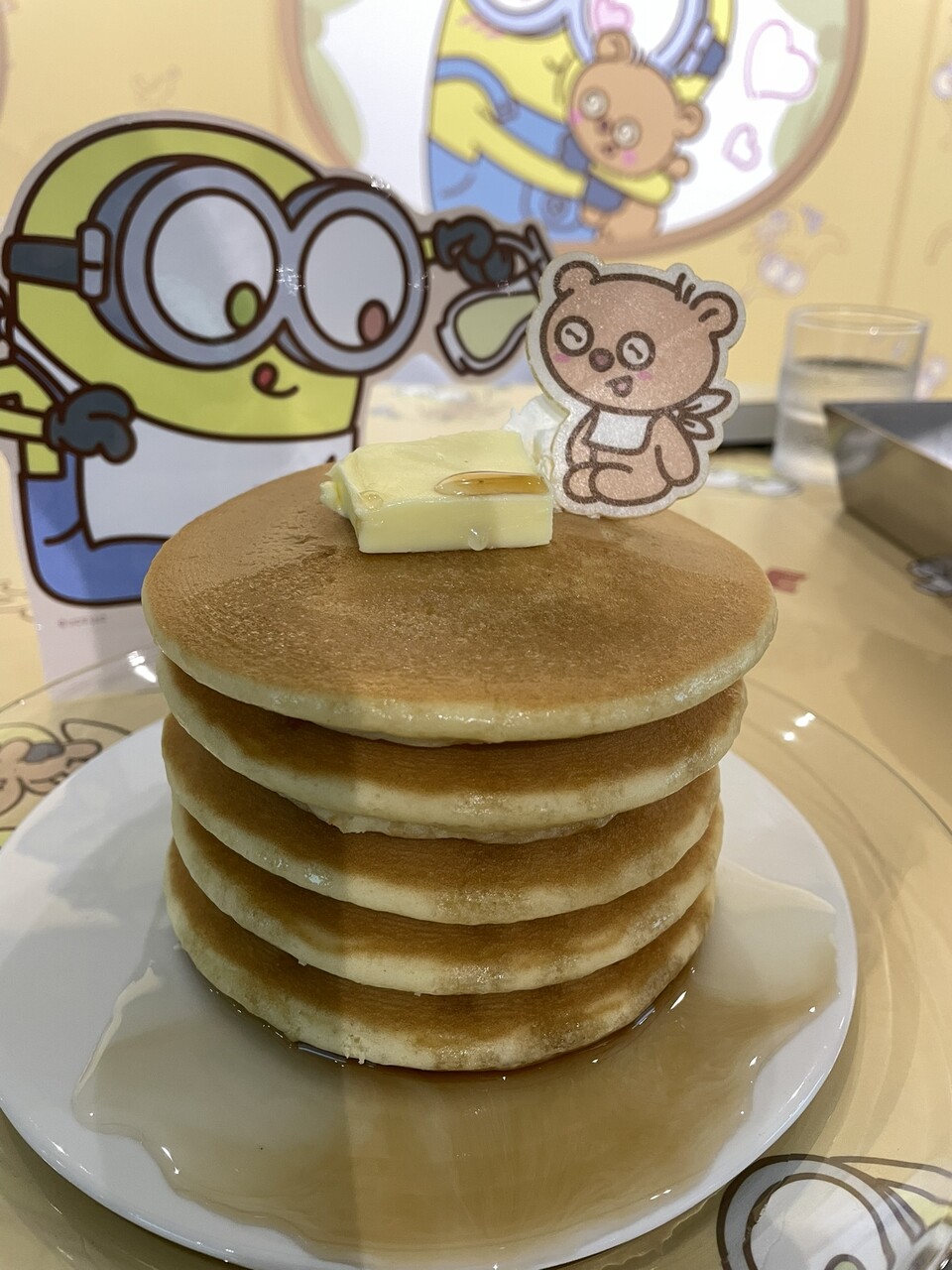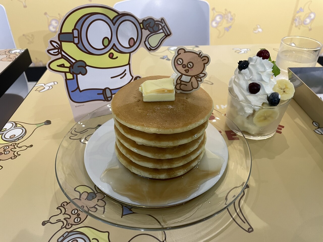 ボブのPOPはレンタルです。上にのっているティムはモナカ?みたいで食べられます。パンケーキの枚数は5枚でボリュームあるパンケーキでした。切るのも食べるのもけっこう大変です。一緒に出されたホイップかけのバナナとブルーベリーはいいアクセントになっていました。
