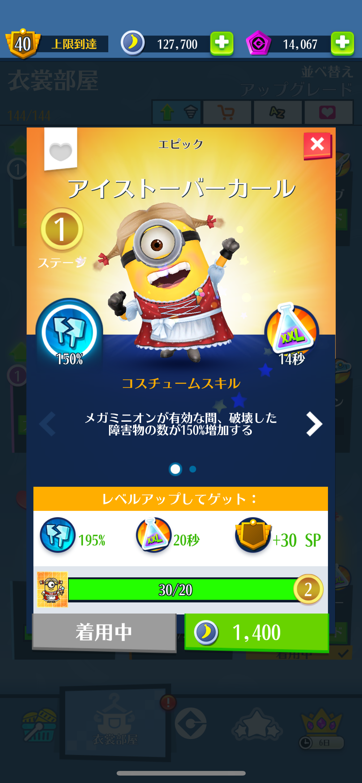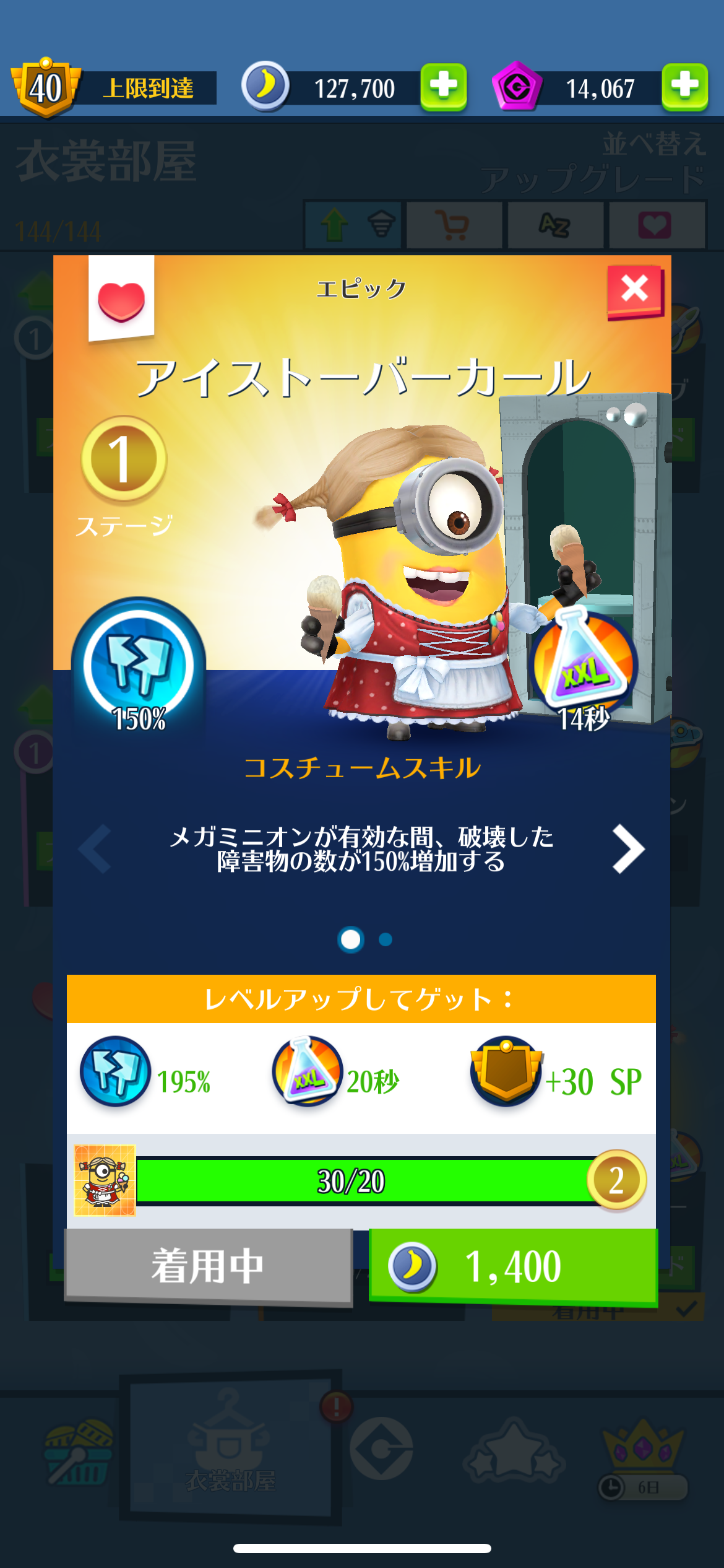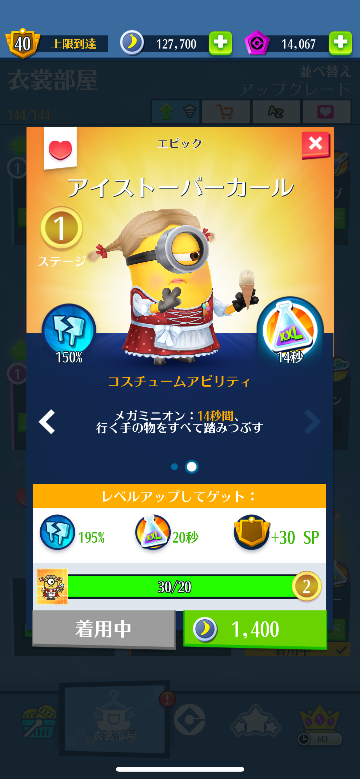 スペシャルミッション:アイストーバーフェストをクリア 2023年09月30日 スペシャルミッション:アイストーバーフェストをクリアしました。今回はわりとゆっくりとプレイしてたので終了2、3日前に終えました。背後でモブが腕組をしてぐるぐる回っているのがとっても可愛かったです。新コスチューム、アイストーバーカールもゲット。女装コスチュームはやっぱり可愛いです。メガミニオンになると可愛さもジャイアントサイズに(違)。後ろ姿も可愛いです♪そして気になるスカートの中身は…。はい、いつもどおりのオーバーオールでした。外見は化粧もしてばっちり決めているのにこの手抜きっぷりがなんとも可愛いです。 < 前の記事次の記事 >