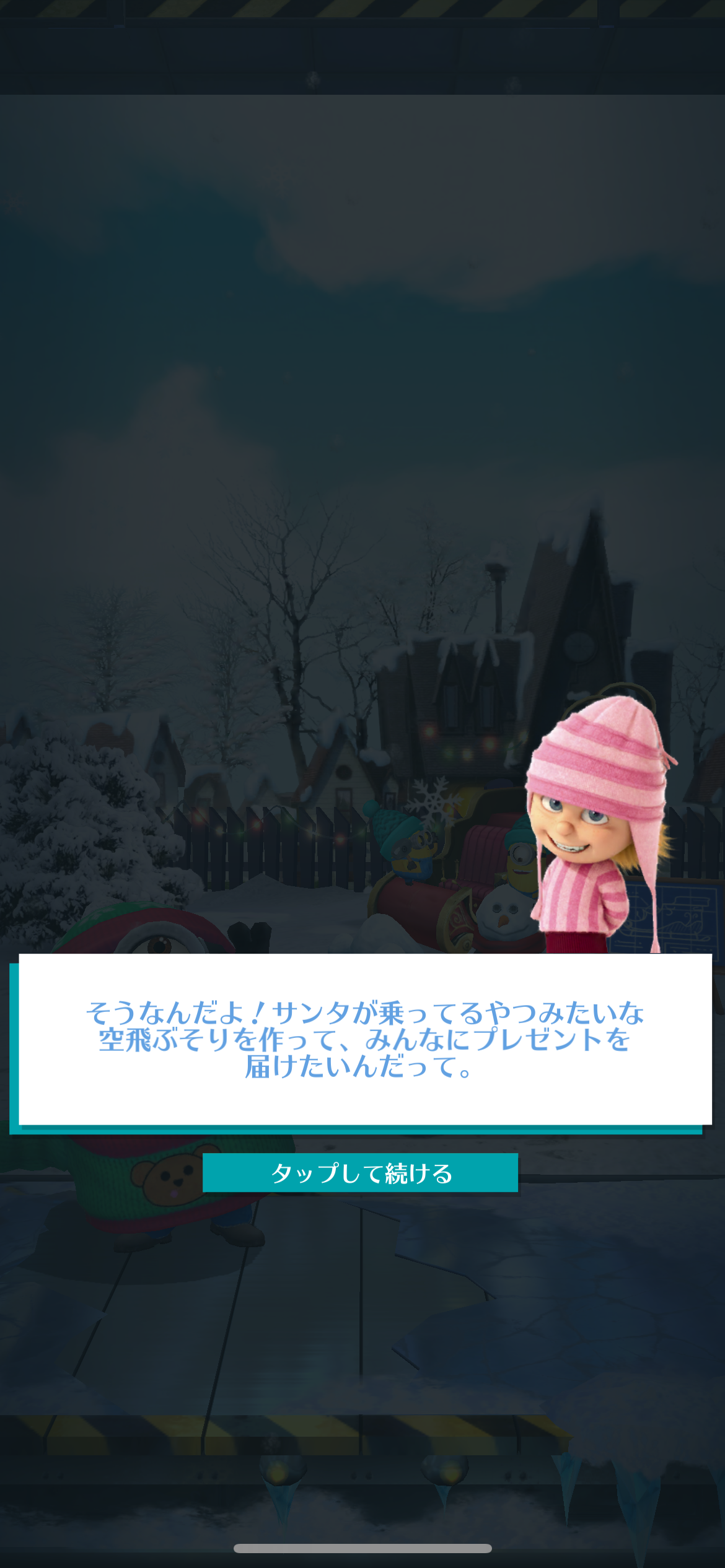 ワールドツアーから戻ったミニオンたちと三姉妹。サンタが乗っている空飛ぶそりを作ってみんなにプレゼントを届けようと思いつく。
