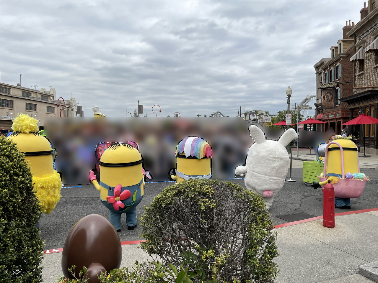 ベンチから見た光景。ミニオンたちとゲストが触れ合って写真撮影している様子は見てて微笑ましかったです。