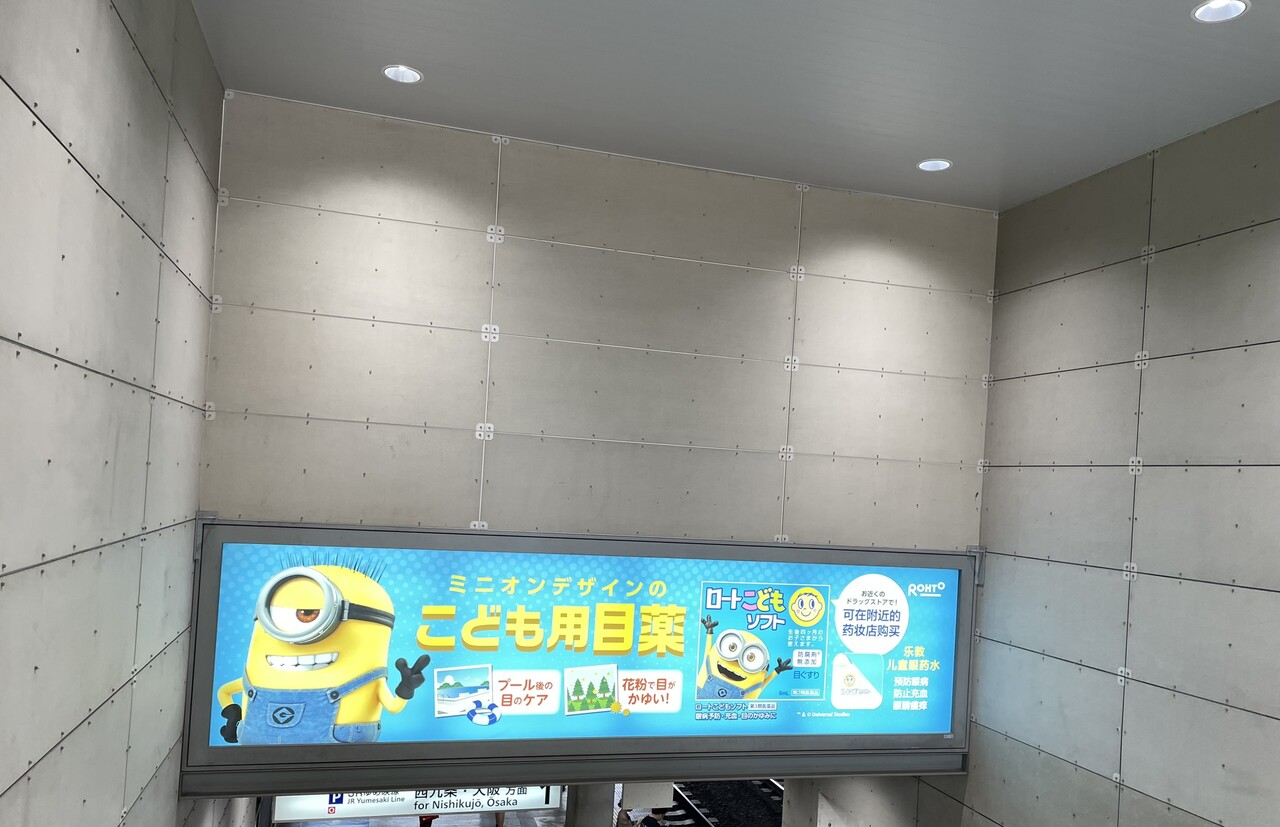 ホームに降りる階段の上にはミニオンデザインのこども用目薬の看板が飾られています。
