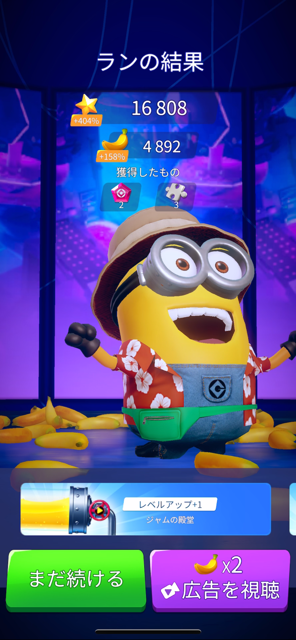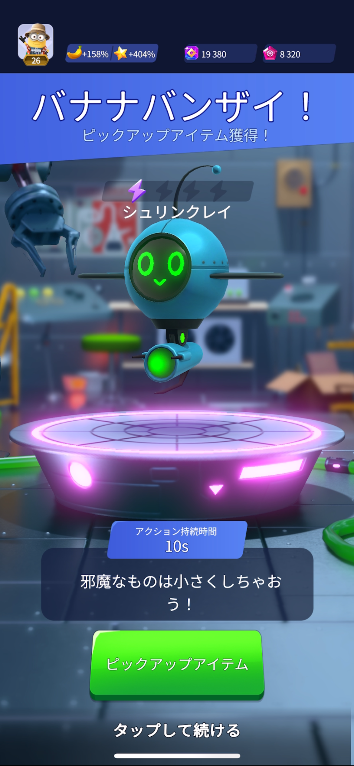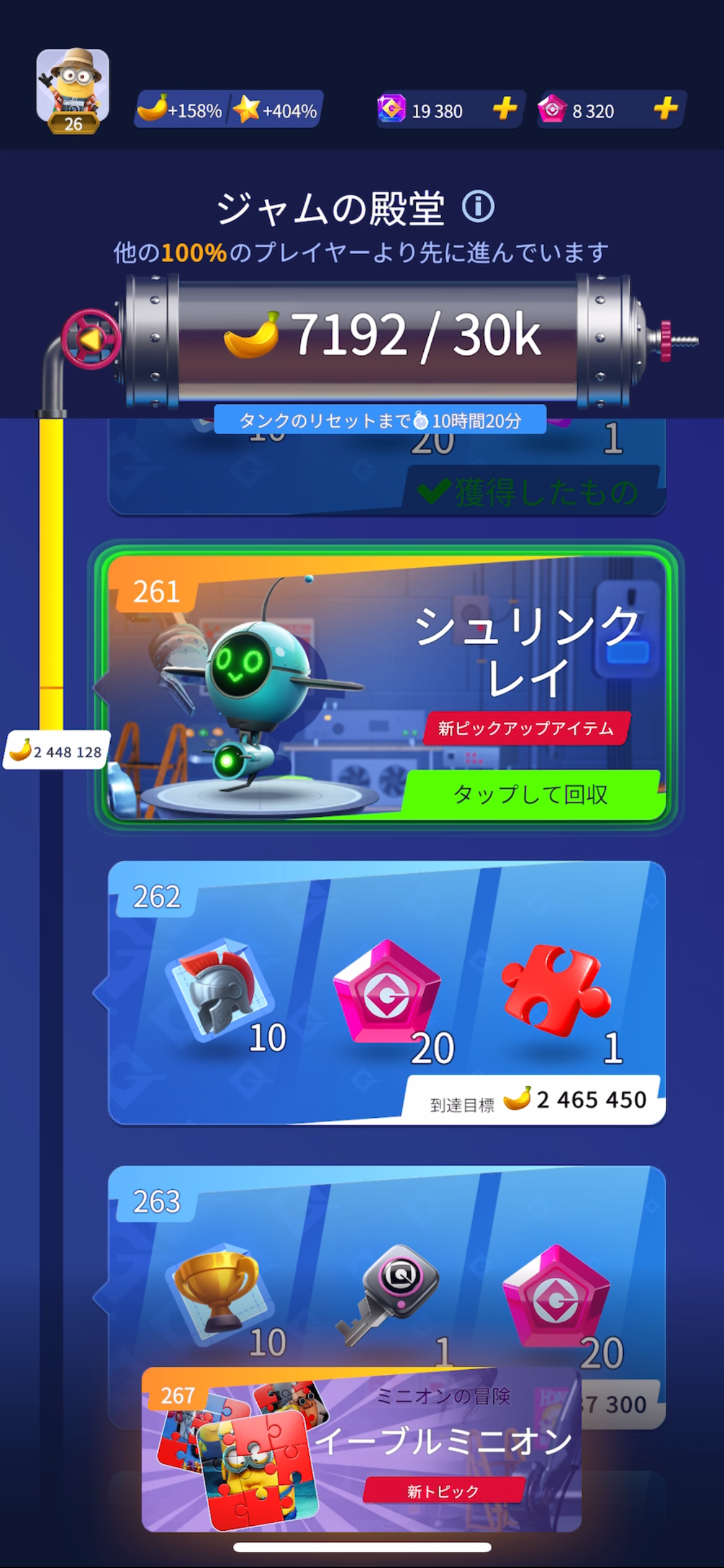 毎日ちまちまプレイしてるミニオンラッシュ。バナナを集めてジャムの殿堂のステージ261に到達して、新ピックアップアイテム「シュリンクレイ」をゲットしました。